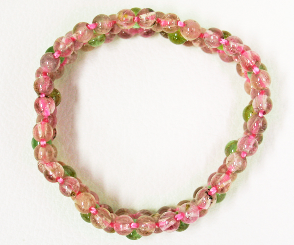 「ウォーターメロン(すいか)」と呼ばれる、外側が緑、中央がピンク色をしたトルマリンから作られた、透明感のある3Aクラスのビーズを使用し、花模様のように編んだ品です。